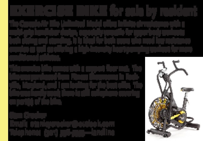 The Cascade Air Bike Unlimited Model offers infinite air resistance with a multi-grip handlebar design, especially versatile for upper body workouts both sitting and standing. It is ideal for both users who need low resistance exercise as well as offering a high-intensity heart-pumping workout for more conditioned athletes. This exercise bike comes with a support floor mat. The bike was purchased from Fitness Showrooms in Rock ville, Maryland, and I am looking for the best offer. The bike was hardly used; there is still cellophane covering on part(s) of the bike. Stan Crocker Email: stanleycrocker@outlook.com Telephone: (301) 598-5953—landline